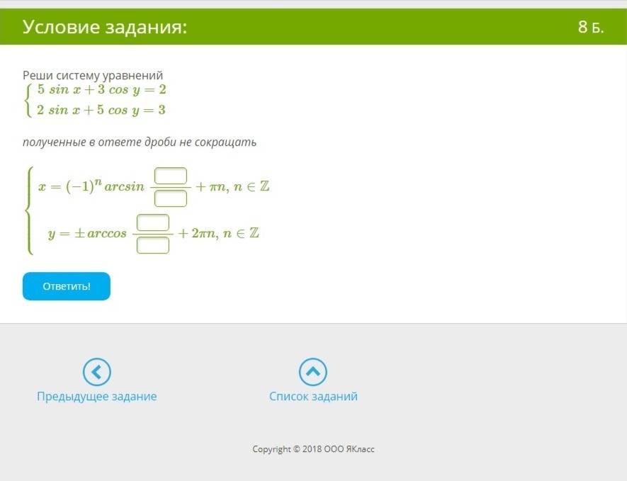 Получите помощь в решении задачи по простая система но нужна срочно! 20 баллов Реши систему уравнений {5sinx+3cosy=2 {2sinx+5cosy=3 для школьников 5 - 9 класс. Прочитайте множественные ответы и обсудите задачи с другими участниками. Ответы на этот вопрос уже есть. Присоединяйтесь к нашему сообществу, задавайте вопросы и становитесь экспертом!