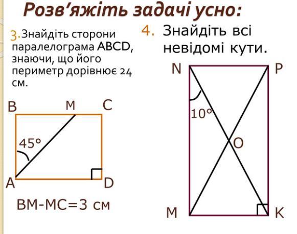 АВ=ВМ, т.к. угол М тоже 45°, тогда МС=ВМ-3=АВ-3, а периметр 2АВ+2(АВ+МС)=24; 2АВ+2(АВ+АВ-3)=24; 6АВ-6=24; АВ=30/6=5/см/, АВ= СD=5см; тогда МС=5-3=2/см/, AD=ВС=5+2=7/см/