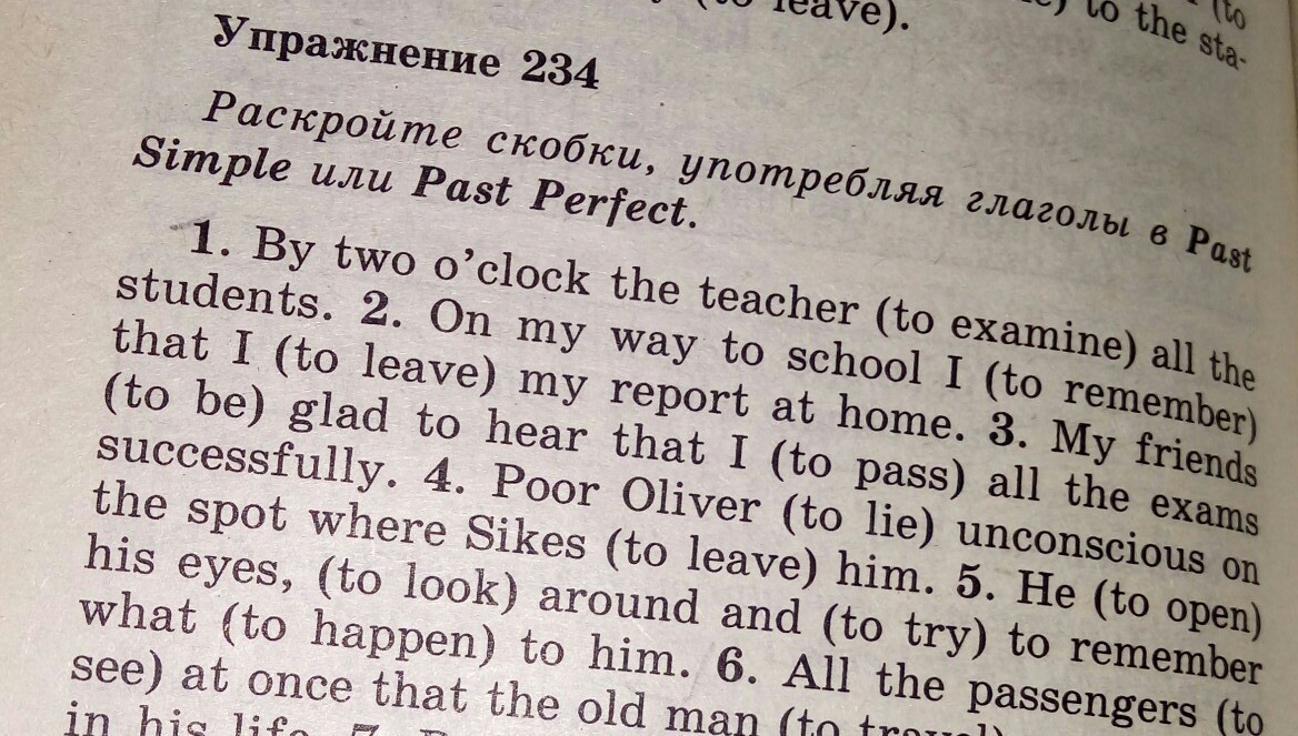 1. By two o’clock the teacher examined all the students. 2. On my way to school i remembered that i leaved my report at home. 3. My friends was be glad to hear that i passed all the exams successfully. 4. Poor Oliver lied unconscious on the spot where Sikes leaved him. 5. He opening his eyes, looked around and tryed to remember what happened to him.