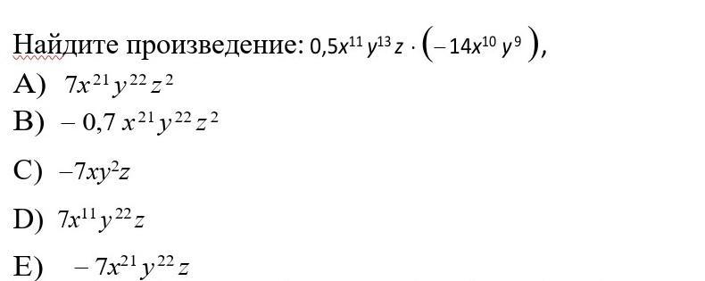 Произведение 0,5х¹¹у¹³z×(-14x¹⁰y⁹) равно -7x²¹y²²z.