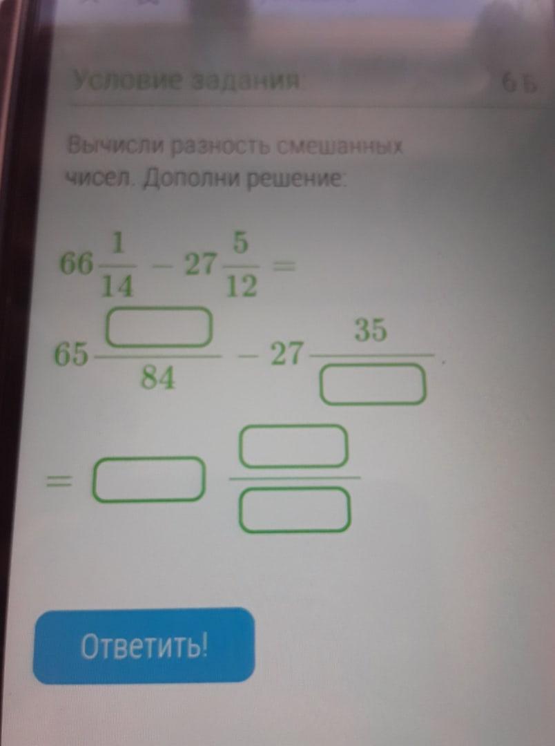 66 1/14- 27 5/12= 62 6/84 — 27 35/84= 35 8-35=======34 92-35