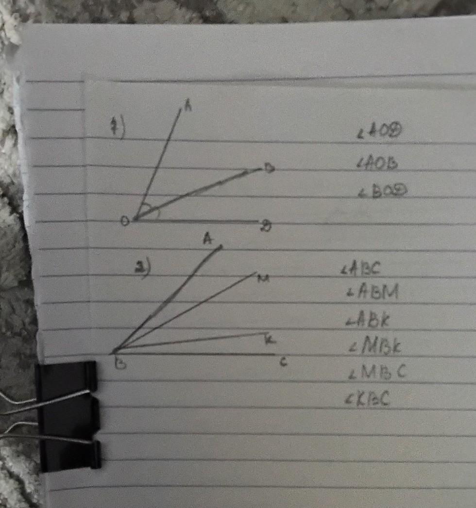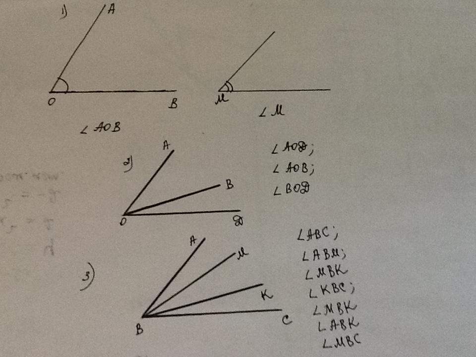 в) побудувати кут АВС, провести між сторонами кута промені ВМ та ВК і записати утворені кути.