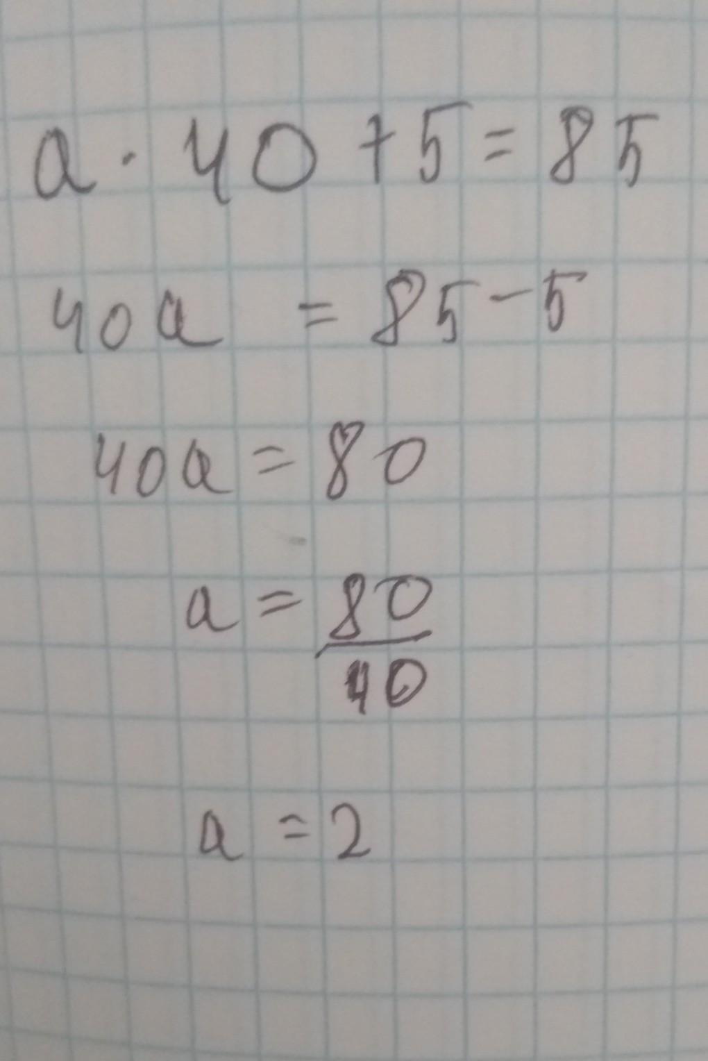 Ищете ответы на вопрос по а*40+5=85уранение сколько выйдет помогите для 5 - 9 класс? На странице собраны решения и советы по предмету Математика, а также обсуждения от других участников. Ответы на этот вопрос уже есть. Вы можете задать свой вопрос, а также стать частью нашего сообщества экспертов.