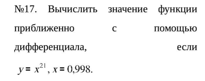 f(0.998) тут должен быть знак примерно= f(1) + f ‘(1)(0.002) = 1 + 21 *0.002 = 1.042