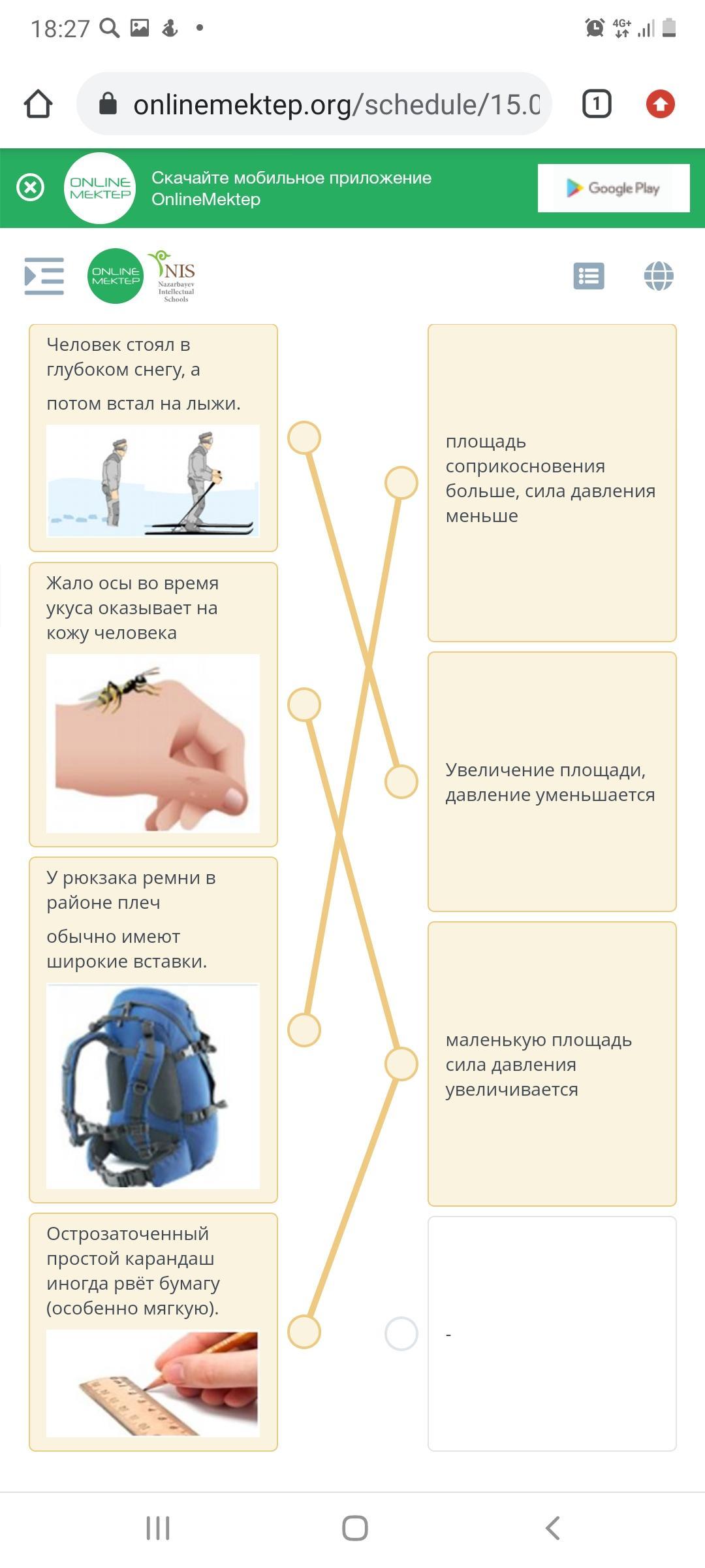 Решение задачи по Соотнесите вопросы левого столбца с ответами правого столбца Количество связей: 4 Человек стоял в глубоком снегу, а потом встал на лыжи. Площадь соприкосновения больше, сила давления меньше Жало осы во время укуса оказывает на кожу человека увеличение площади, давление уменьшается для школьников 5 - 9 класс. Узнайте, как решить задачу, читайте обсуждения и ответы на тему Физика. Ответы на этот вопрос уже добавлены. Наш сайт предоставляет вам возможность задавать вопросы и помогать другим стать лучше.