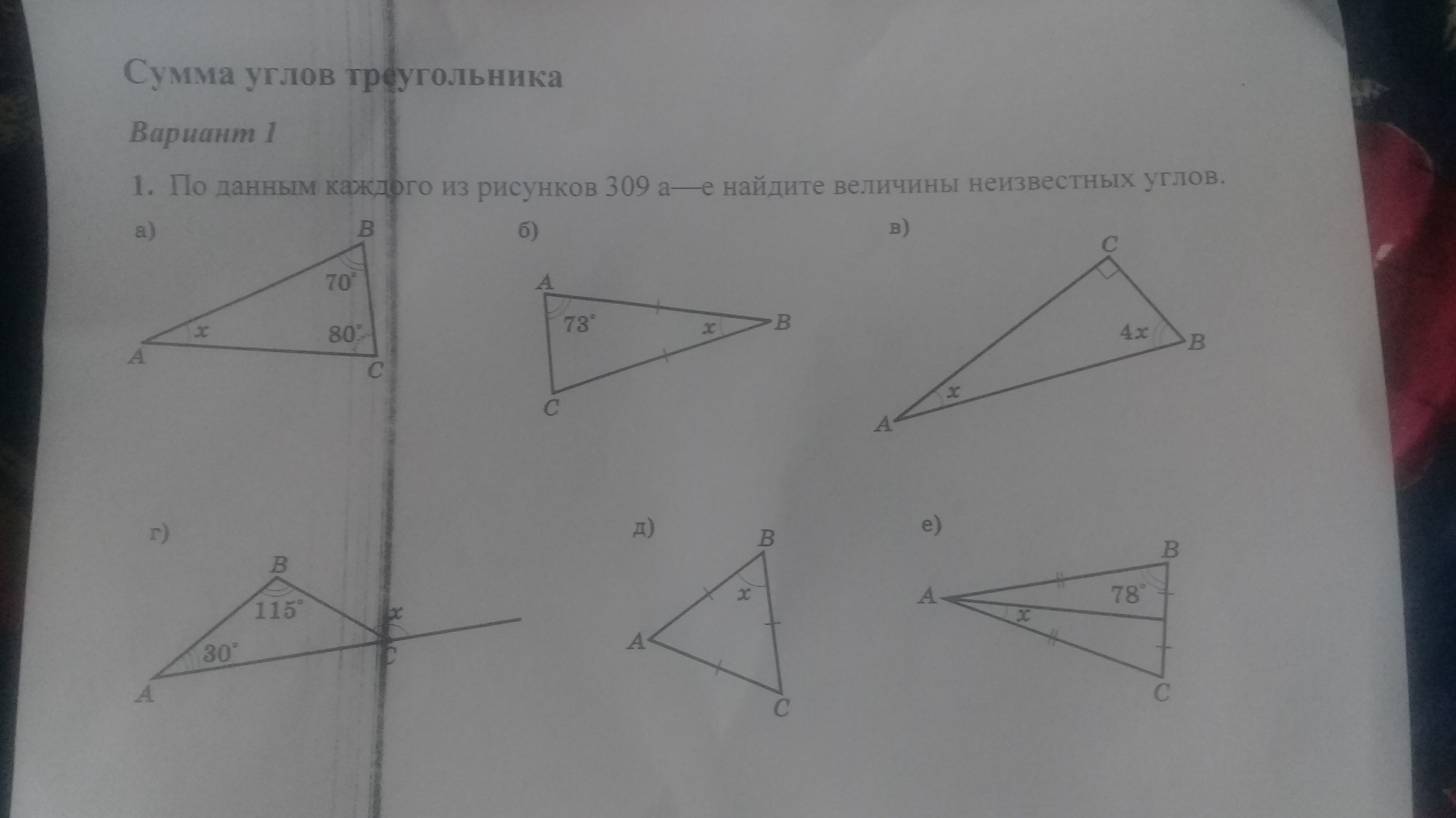 д)х=60(равносторонний треугольник, любой угол равен 60)