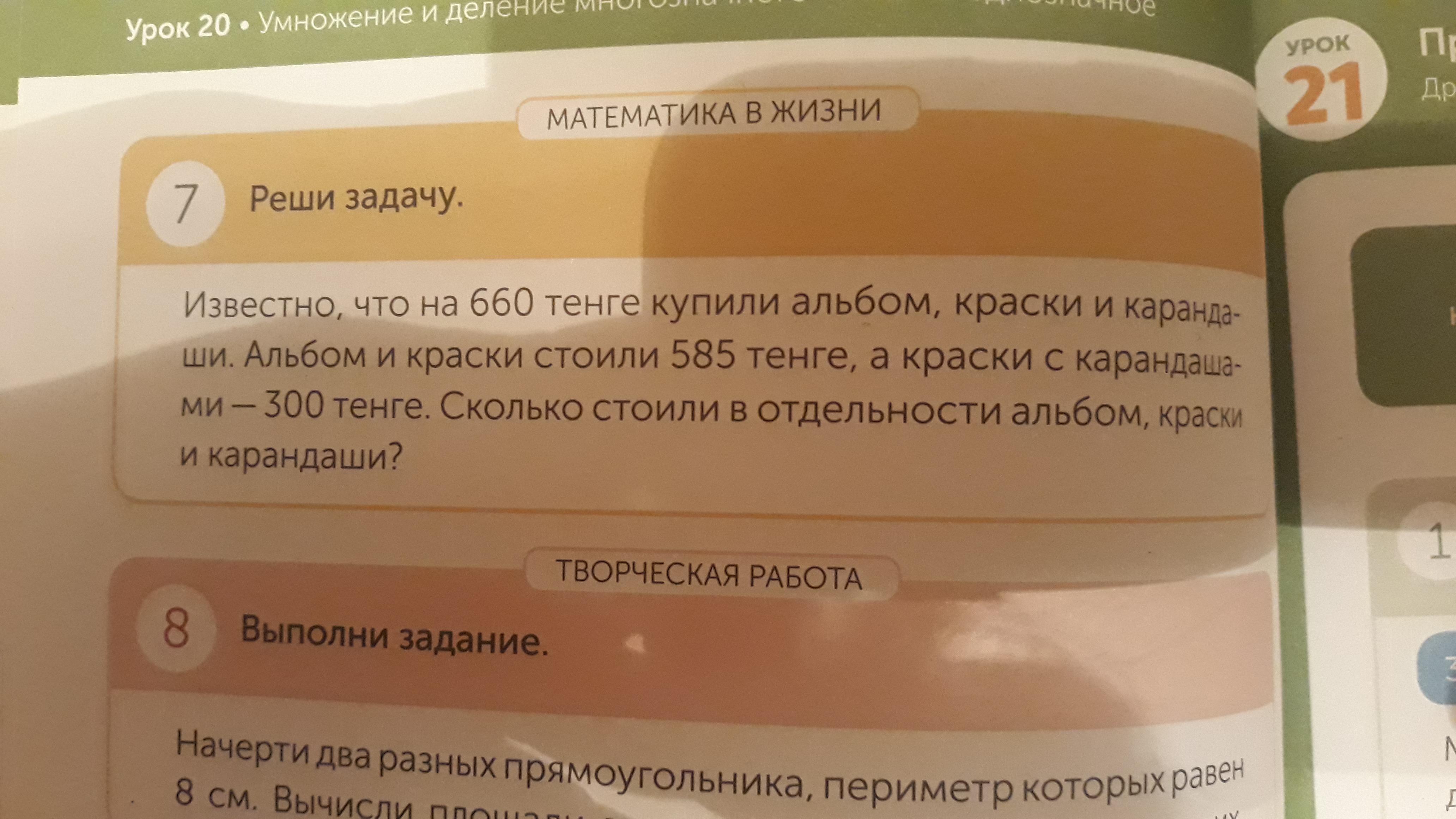 Если всего у нас 660тг,а альбом+краски стоит 585 то что бы узнать сколько стоят карандаши(отдельно) нужно 660 отнять 585:1)660-585=75(тг)-карандаши.