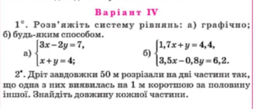 Получите помощь в решении задачи по 1. Розв'яжіть систему рівнянь: а) графічно; б) будь яким способом 2. Дріт завдовжки 50м розрізали на дві частини так, що одна з них виявилась на 1м коротшою за половину іншої. Знайдіть довжину кожної частини. для школьников студенческий. Прочитайте множественные ответы и обсудите задачи с другими участниками. Ответы на этот вопрос уже есть. Присоединяйтесь к нашему сообществу, задавайте вопросы и становитесь экспертом!