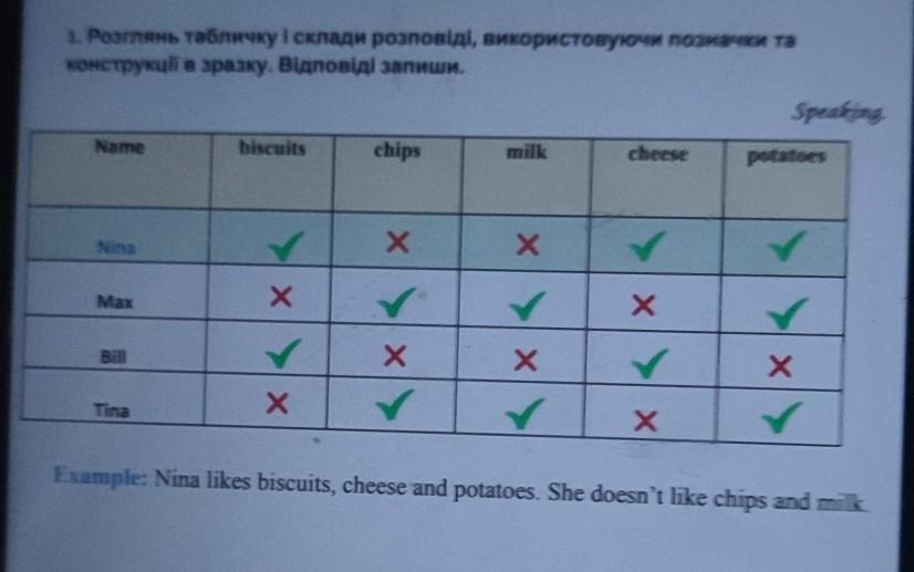 Tina likes chips, milk and potatoes. He doesn’t like biscuits and cheese.