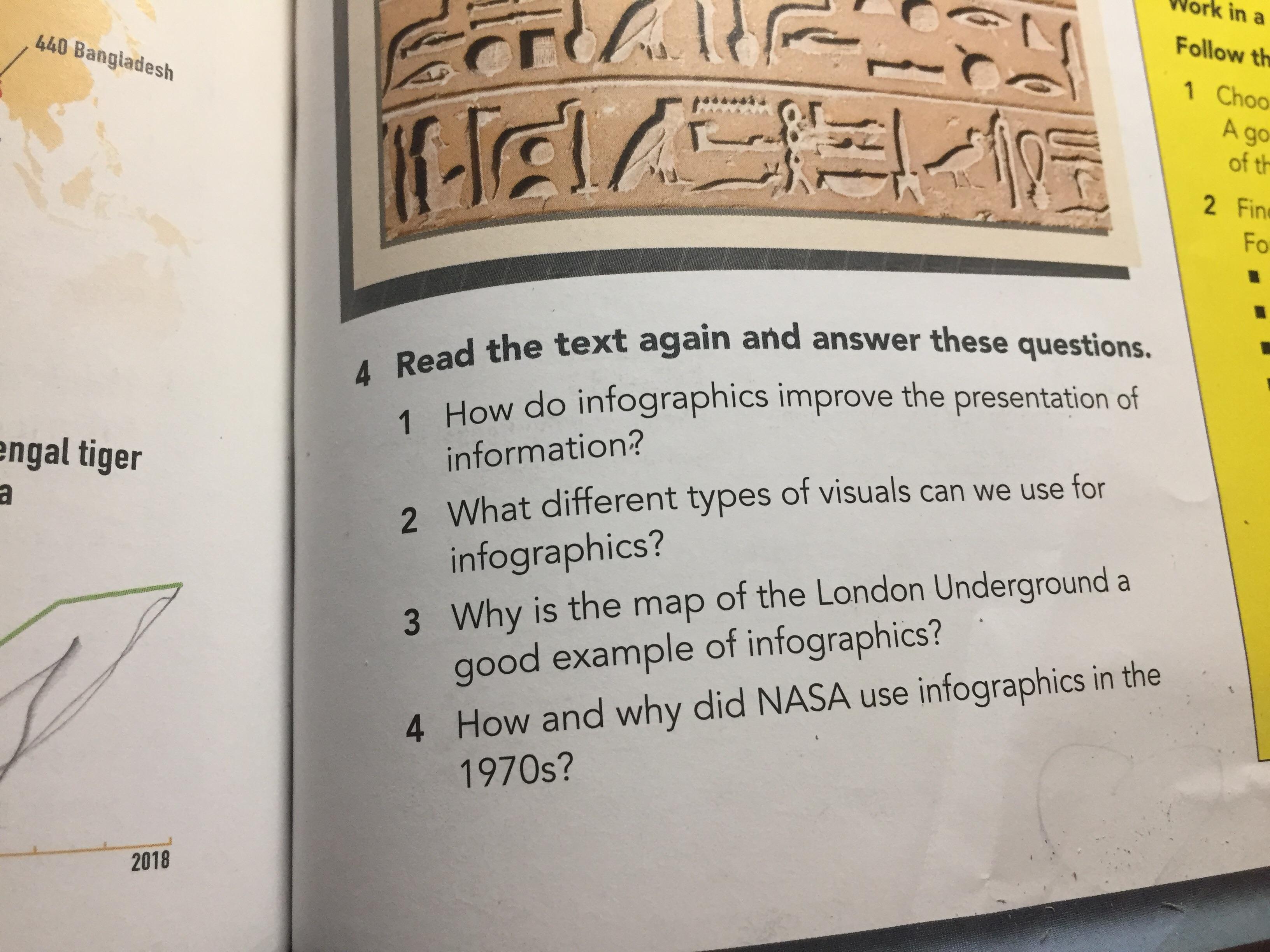 2) thera many of types of visuals: graphs, pie chart, maps, colour coding, diagrams, icons amd tables.