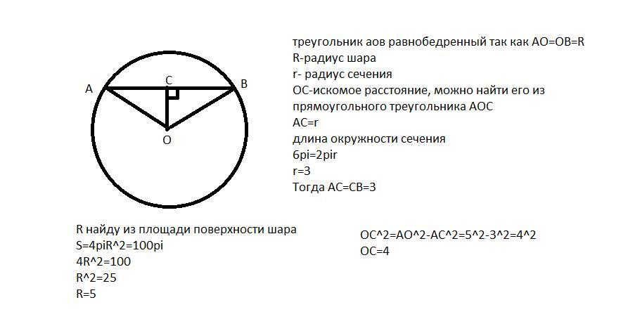 длина окружности сечение шара плоскостью 6п дм. найдите расстояние от плоскости сечения до центра шара, если площадь поверхности шара равна 100п дм