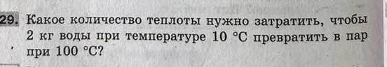 Q2 = L*m, L — удельная теплота парообразования воды (L = 2256 кДж/кг = 2256*10^3 Дж/кг). Q = Q1 + Q2 = C*m*(tк — tн) + L*m = 4187*2*(100 — 10) + (2256*10^3)*2 = 753660 + 4512000 = 5265660 Дж ≈ 5,27 МДж. Ответ: Для парообразования нужно 5,27 МДж теплоты.