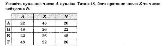 Відповідь: Г) нуклонове число 48, протонове 22, та нейтронів 26