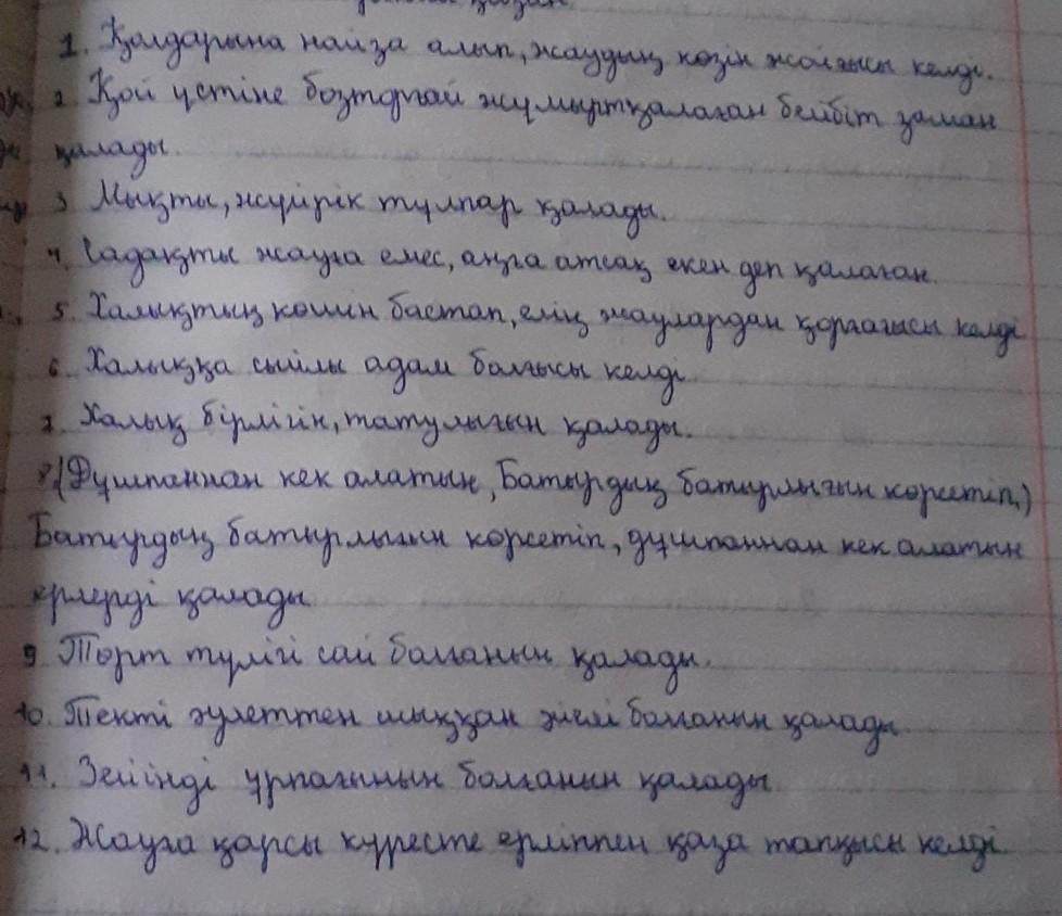 Тапсырма. Мәтін Қан мен тер (романнан үзінді) қалай, тереңге кете ме тайызға шыға ма? Бүгін күн қалай батты, ертең мен Теңіз жайында әңгімелескен керемет әңгіме болатын балықтың бағыты сола ма, жоқ па? Балықшылар бүгін Райдың үйіне жиналды. Олар теңіз жайында, балың жайында әңгімелесіп отырды. Аттылы біреу есік алдына тоқтады. Аттан түсті. Атты байлап, сәлем Кәлен еді. Балықшылар Кәленді таныды. беріп, үйге кірді. Кіріп келген — Балықшы жас жігіт: Аға, отырыңыз! Төрге шығыңыз, — деді. Кален төрге шықпай, төмен отырып: Еламан, саған келдім, дел ойындағысын бірден айтты. Іздеп келдім, — Е, ат ұрлауды қойып, енді балық аулауға шықтың ба? — деді Рай. Балықшылар шошып қалды. Кәлен асықпады. Ол ашуланбай, түн болмаған кісідей жадырап: «Бала ғой», деп жүрсем, ержеткен екенсің, Балықшылар жадырап сала берді. Еламан: — Жарайды, шаруаңды айт! «Саған кісі керек», — дейді ғой. Мені пайшерiк қып алуға қалайсың? Мұз оятын кісі керек пе? Кәсіп — деді. Ал керек. Ендеше мені ал! — Шодырға бар. Билігі сонда. Міне, сөз! Ендігі жерде сендермен бірге жүріп көрейін, — деді. Ертеңінде Еламанға Андрей келді. Сақ бол. Федоров: «Аудың барлығы жарамсыз», – деп жатыр. Ертең сені бар адамыңмен мұз үстіне айдап шығайын деп жатыр. Мұз әлсіз емес пе? Оны мен де айттым. Бірақ Федоров тыңдамайды. Сақ бол! Тек абай- лап сөйлес! — деп кетті Иван. ВСЕ ГЛАГОЛЫ!