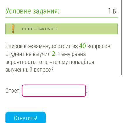 38/40=19/20=0,95 — вероятность того, что попадет выученный билет.