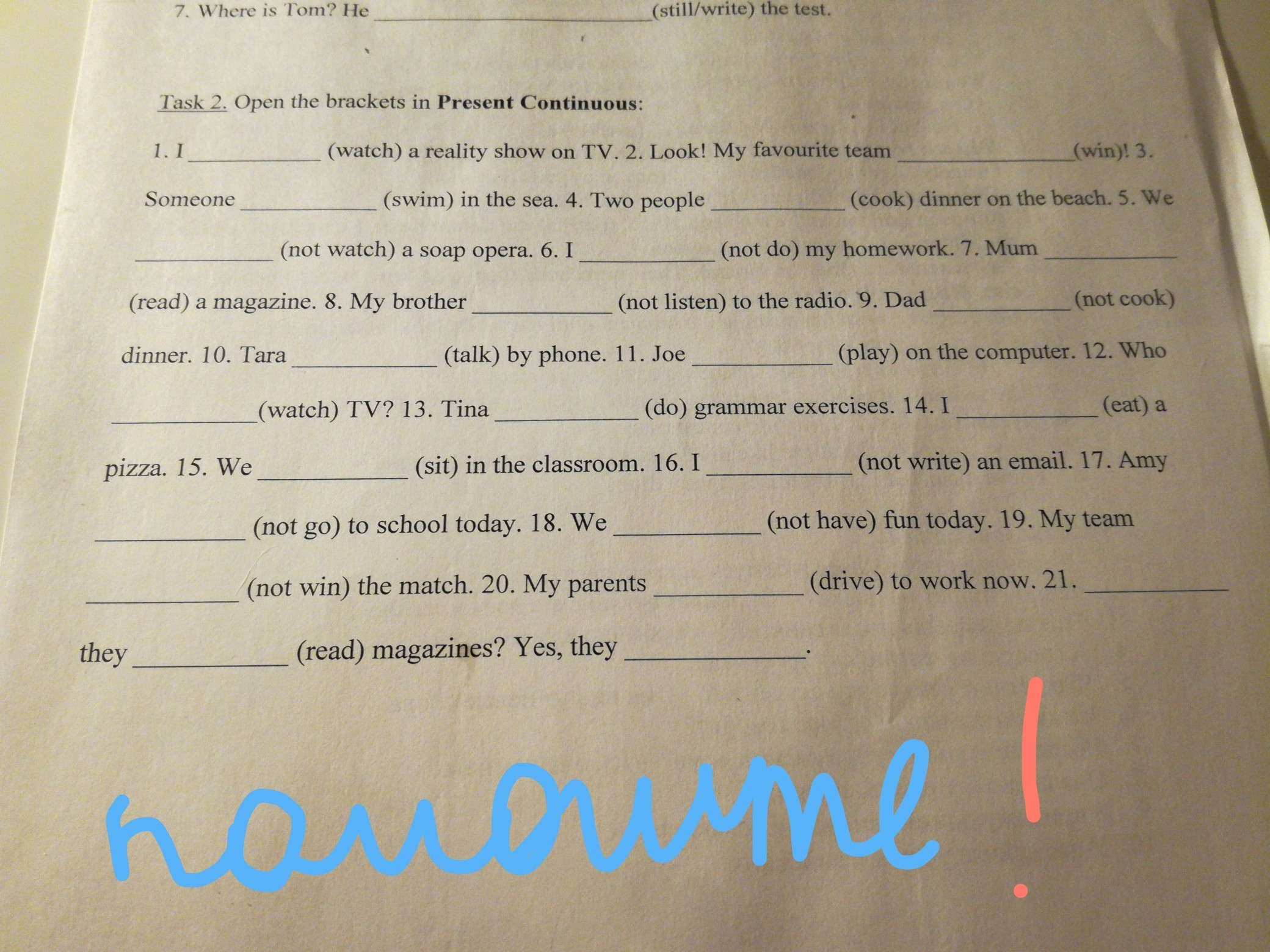 I am watching a reality show on TV.Look!My favourite team is wining.Someone are swiming in the sea.Two people are cooking dinner on the beach.We aren’t watching a soap opera.I isn’t doing my homework.Mum are reading a magazine.My brother isn’t listening to the radio.Dad isn’t cooking dinner.Tara is talking by phone.Joe is playing on ghe computer.Who is watching TV?Tina is doing grammar ex.I am eating. 15.We are siting.16I isn’t writing.17.My isn’t going.18.We aren’t having.19.My team isn’t wining.20.My parents are driving.21.Are they reading.Yes,they are =3