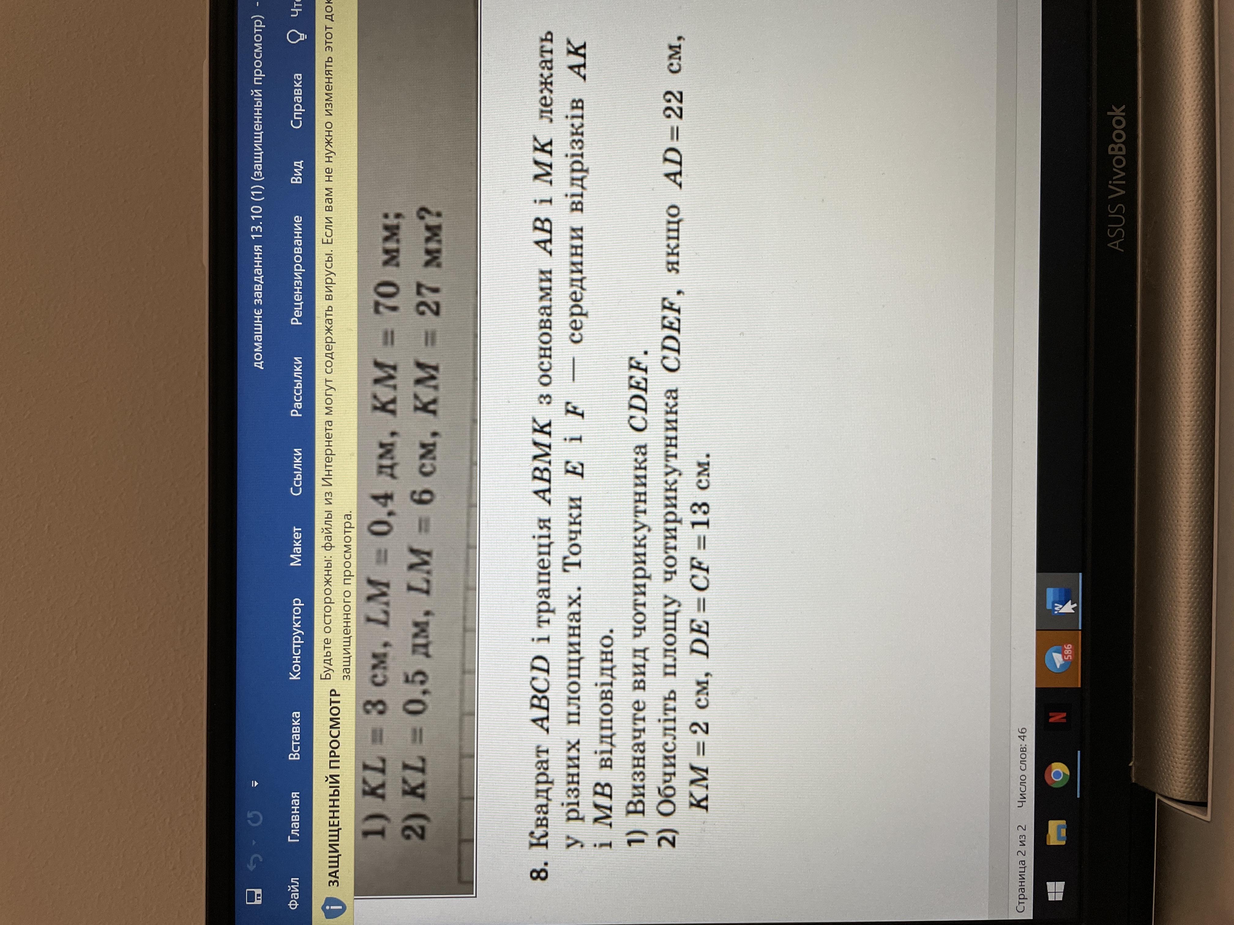 2) Верхнее основание трапеции CDEF равно средней линии трапеции ABMK. EF = (2 + 22)/2 = 24/2 = 12 см.