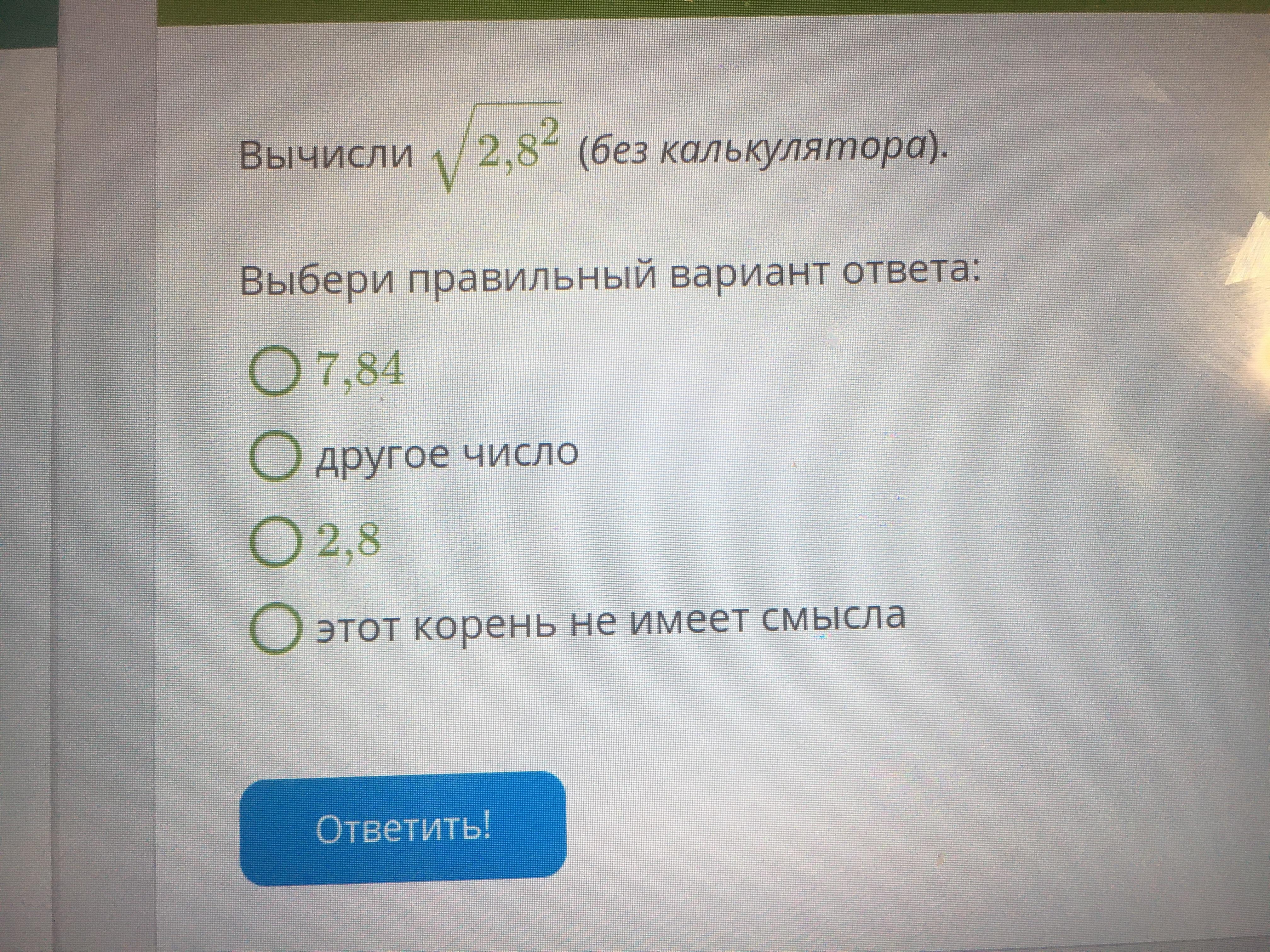 Корень из 2.8 в квадрате, равен 2.8