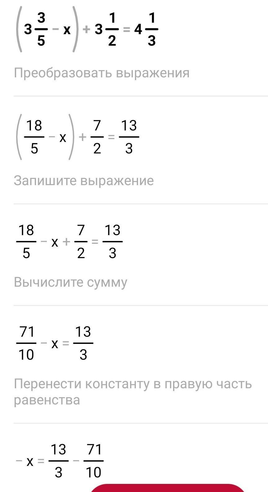 Ответы на вопрос по Решите уранение ( 3-3/5 - x) + 3 1/2 = 4 1/3 Помогите пожалуйста для школьников 5 - 9 класс. Узнайте подробные решения и подходы от других участников. Ответы на этот вопрос уже добавлены. На нашем сайте можно не только задать вопросы, но и стать экспертом, помогая другим пользователям.