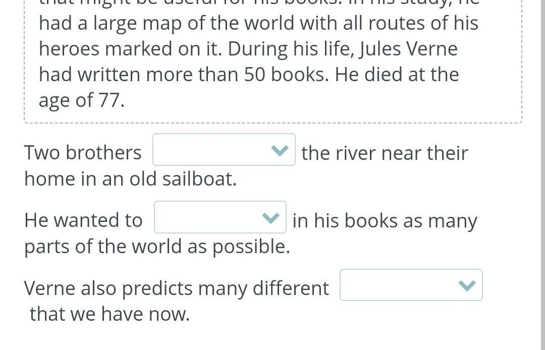 Ищете решение задачи по Jules Gabriel Verne Click the most appropriate option to fill the gap and complete the sentence. Jules Gabriel Verne Jules Verne was born in 1828 in France. Young Jules was interested in machinery, sailing, and writing. Together with his brother Paul, he explored the river near their home in an old sailboat. Jules' father was a lawyer, and he wanted his son to continue his career. So Jules was sent to Paris to study law. Jules, however, decided that his main interest was writing. He joined the club of scientific writers. His favorite subject at school was geography, so he wanted to describe in his books as many parts of the world as possible. Jules Verne's books are still popular now because they are good adventure stories. However, in his books, Verne also predicted different inventions that we have now. He believed that someday people would have airplanes, submarines, television, dirigibles, and powerful weapons. His books are “Twenty Thousand Leagues Under the Sea”, “Journey to the Centre of the Earth” and “Around the World in Eighty Days” and many others. Verne had a notebook where he wrote every idea or a bit of information he came across that might be useful for his books. In his study, he had a large map of the world with all routes of his heroes marked on it. During his life, Jules Verne had written more than 50 books. He died at the age of 77. ? Узнайте, как решить задачу для школьников студенческий, и читайте обсуждения на тему Английский язык. Ответы уже доступны. Задавайте свои вопросы и становитесь частью нашего сообщества экспертов!
