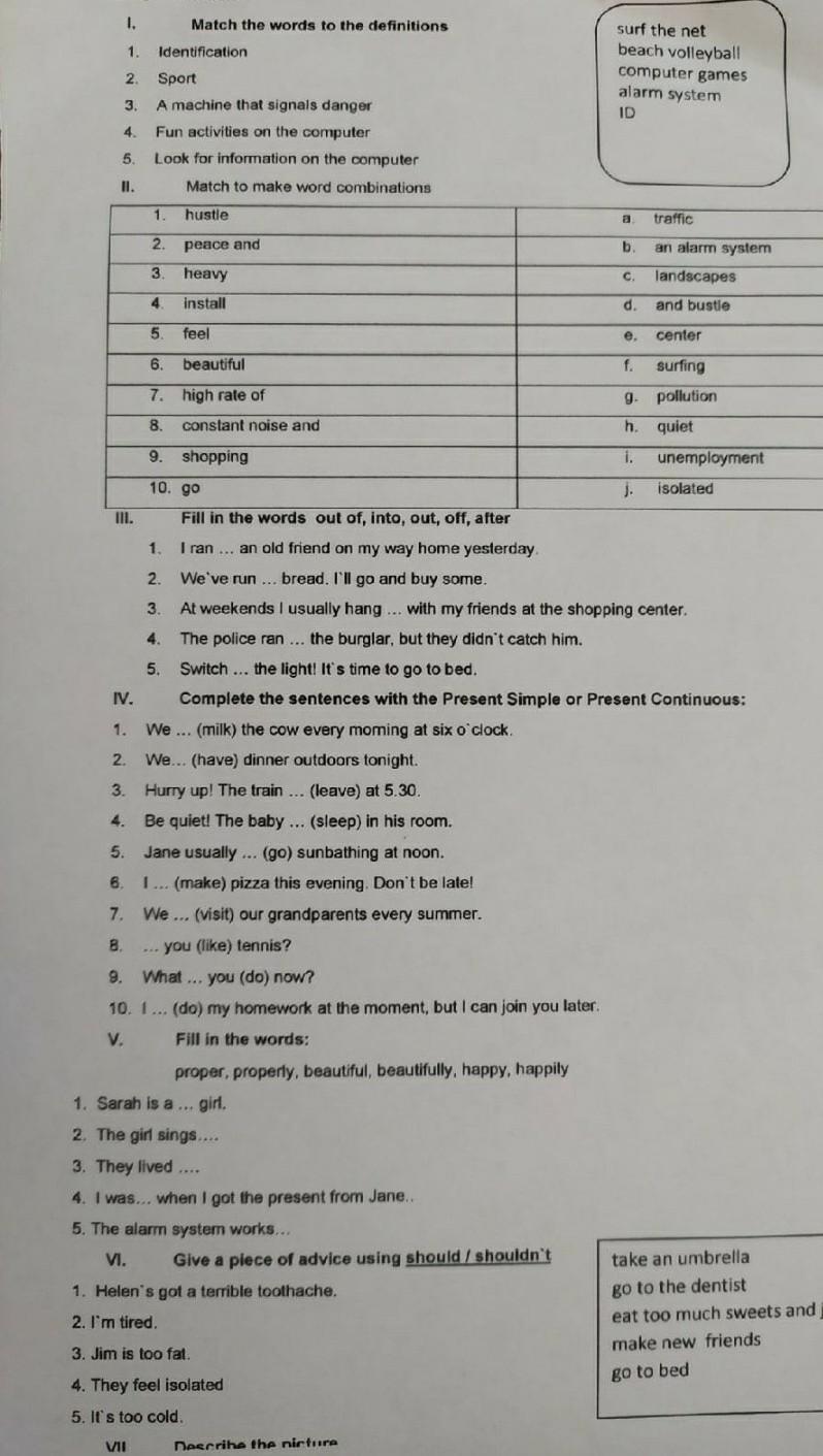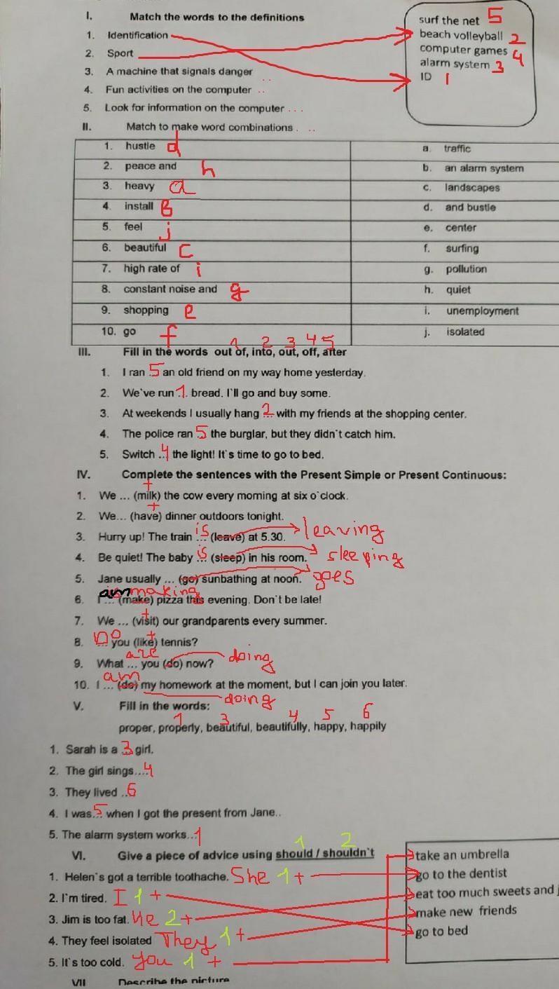 1 — into; 2 — out of; 3 — out; 4 — after; 5 — off