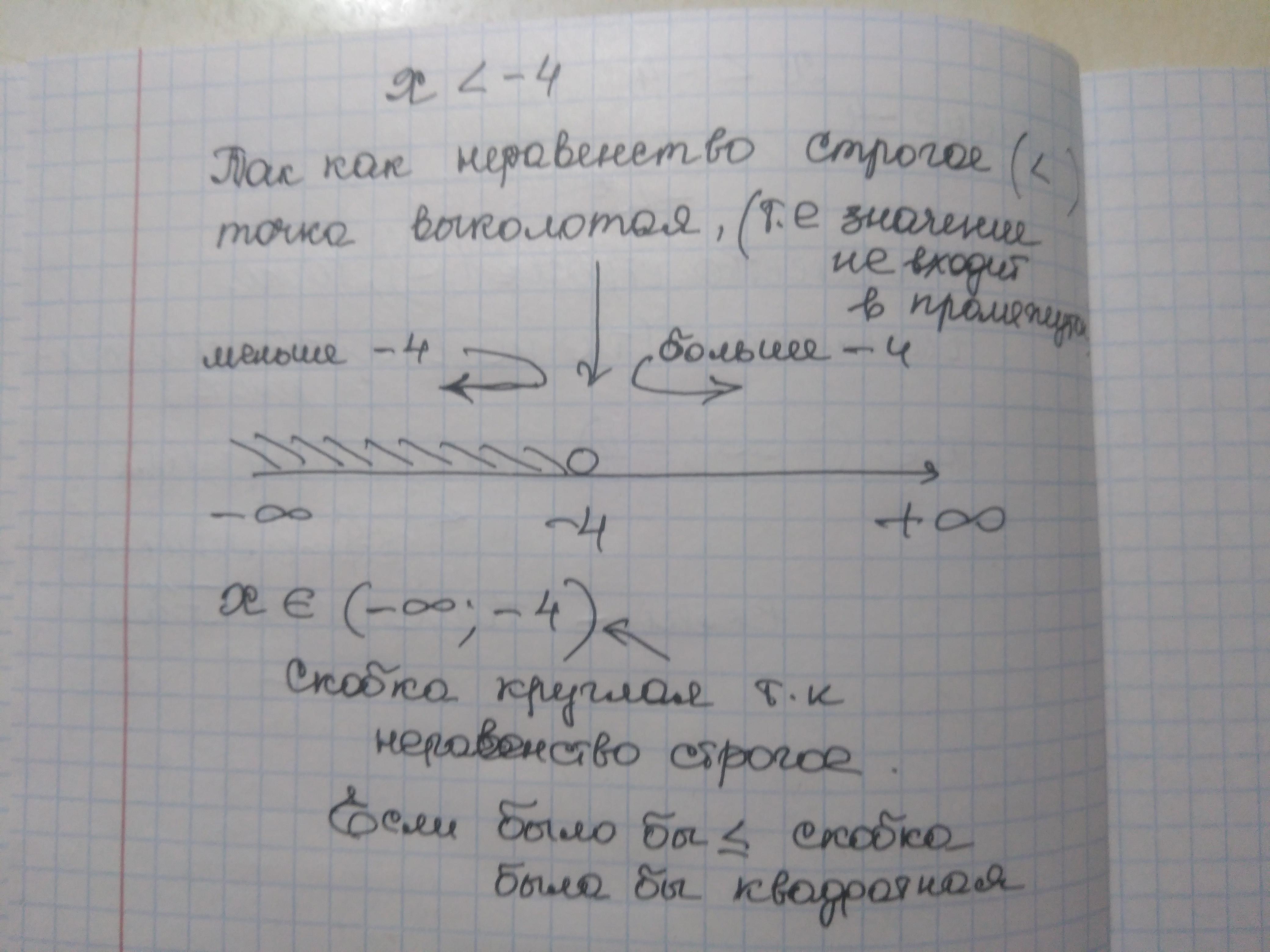 При решении неравенства получился ответ х<-4. Как отметить на координатной прямой это число? И какими будут скобки и знак у бесконечности? Если можно, объясните подробно по фото и почему именно в эту сторону пошли ветви.