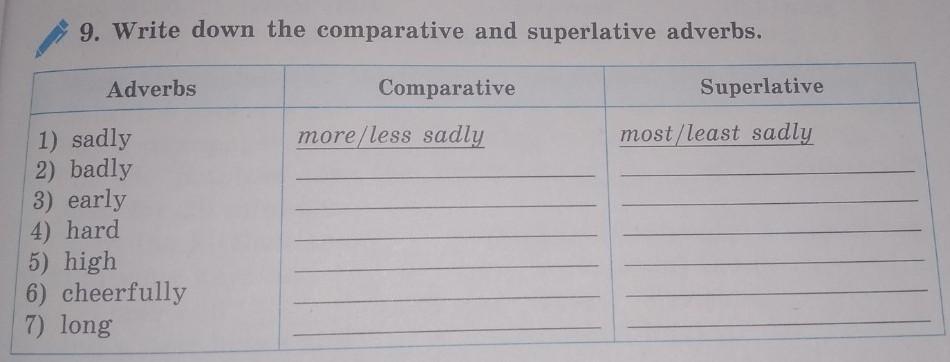 образуй степени прилагательных:kind,dirty, big, large, good, happy,sad,bad, sunny,clean.