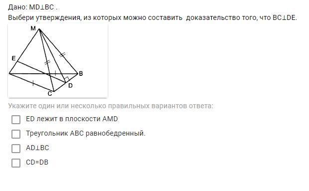 Задача по Дано: MD⊥BC . Выбери утверждения, из которых можно составить доказательство того, что BC⊥DE. для школьников студенческий. Узнайте решение и получите подробное объяснение по теме Математика. Ответы на этот вопрос уже опубликованы. Не забывайте, что вы можете задать вопрос или поделиться собственным решением, став экспертом для других!