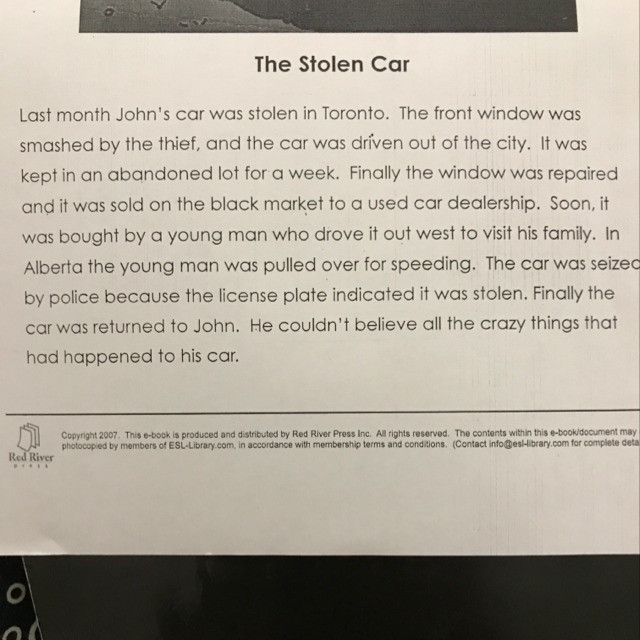 В прошлом месяце в Торонто похитили машину Джона. Переднее стекло разбил вор и его увезли за городом. Его оставили в заброшенной парковке на неделю. Потом стекло починили и его продали на чёрном рынке. Машину потом купил молодой парень который должен был поехать на восток что бы увидеть семью. В Альберте его остановили за превышение скорости. Машину захватили полицейские потому что номерной знак показал что он украденный. На конец машину вернули Джону. Он не мог поверить что всё это произошёл с его машиной.