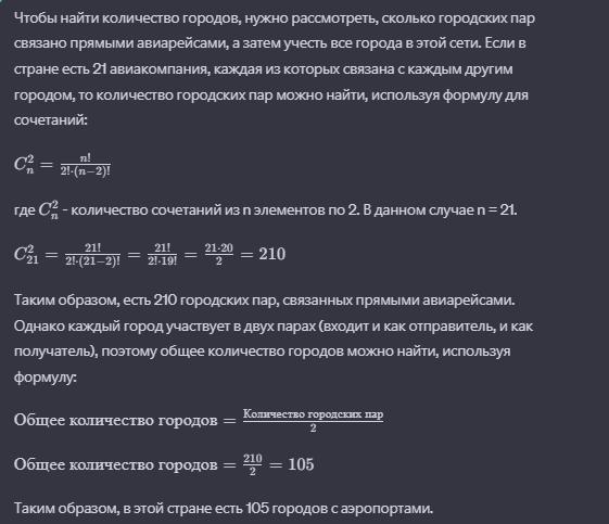 А можно проще. Каждый город соединен с n-1 городом это n(n-1) соединение, но в этом случае мы каждое соединение считаем 2 раза, потому n(n-1)=2*21 и тот же ответ. Но это уже после первого решения.