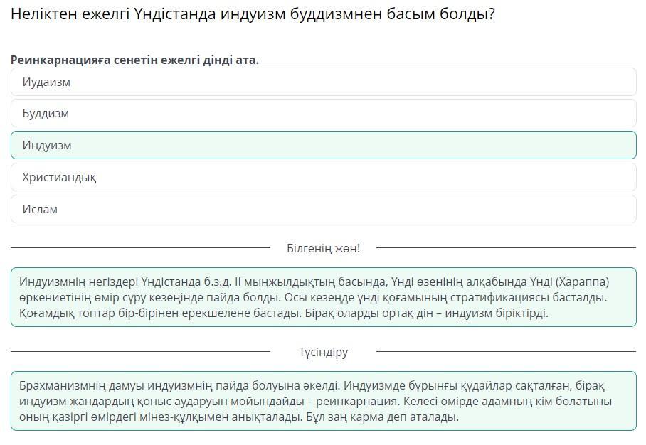 Брахманизмнің дамуы индуизмнің пайда болуына әкелді. Индуизмде бұрынғы құдайлар сақталған, бірақ индуизм жандардың қоныс аударуын мойындайды – реинкарнация. Келесі өмірде адамның кім болатыны оның қазіргі өмірдегі мінез-құлқымен анықталады. Бұл заң карма деп аталады.
