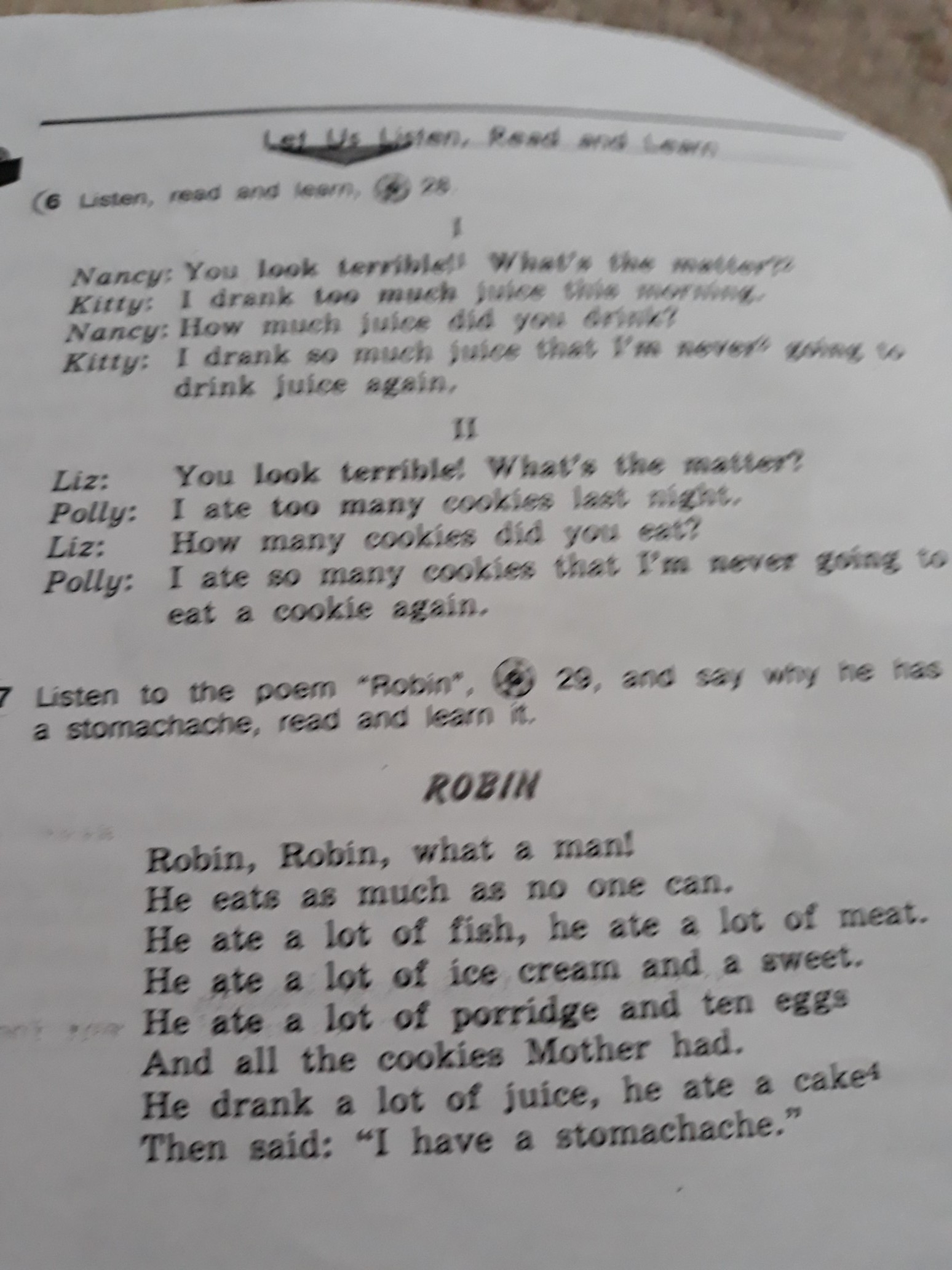 I have a stomachache because he ate a lot of fist, meat, ice cream, smeet, porridge, eggs, cake