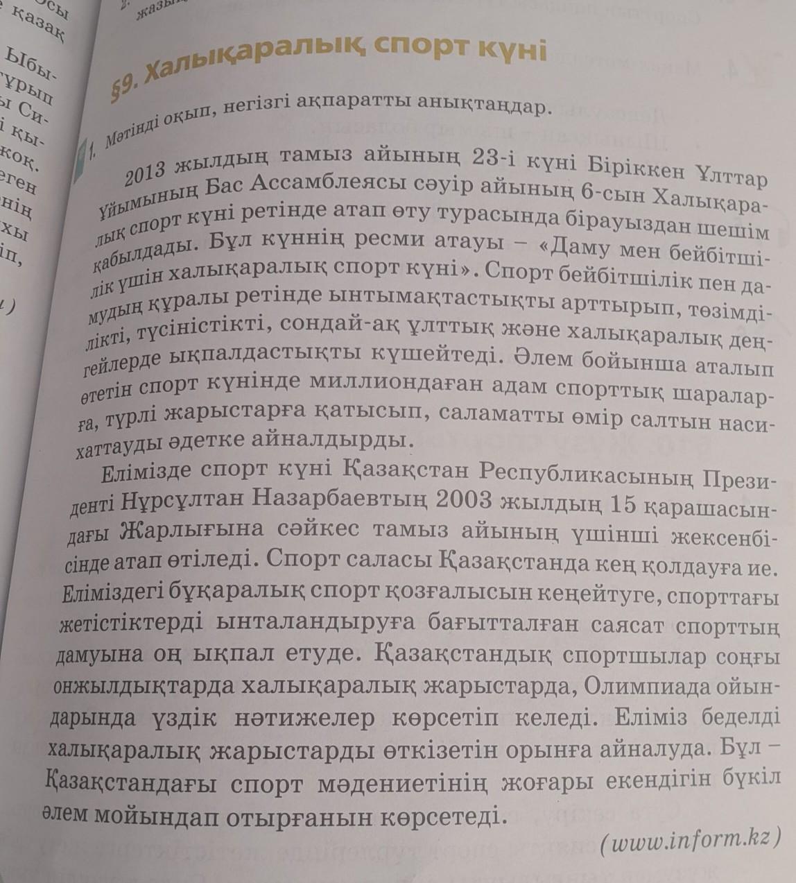 3)Бізде (мектепте) жылына бір рет спор күнін өткізіп тұрады. Ол кезде әр түрлі ойындар ойнаймыз.Өте қызық болады.