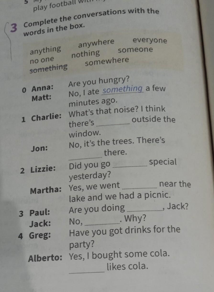 Ищете решение задачи по Хелп ми. даю 60 баллов! Complete the conversation with the words in the box. anything anywhere everyone no one nothing someone something somewhere для 5 - 9 класс? На странице вы найдете не только подробное объяснение задачи, но и обсуждения от других участников. Ответы на этот вопрос уже добавлены. Этот вопрос относится к Английский язык, и помогает разобраться в теме Хелп ми. даю 60 баллов! Complete the conversation with the words in the box. anything anywhere everyone no one nothing someone something somewhere. На нашем сайте вы можете задать собственный вопрос и получить помощь от опытных экспертов.