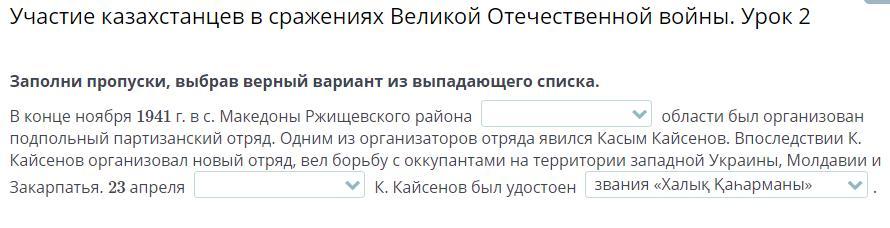 Задание 3. Вставь пропущенное слово (76) 1.Руководителем комитета по формированию Немецкой автономии был назначен.2.В каком городе. студентами -казахами была создано неформальная организация «Жас Тулпар» 3.Изьятию какого региона Казахстана в пользу Туркменистана противостоял А.Ташенов. 4. Д. А. Кунаев возглавил первым секретарем ЦК КІТК с . Годы 5.Сталин называл Жумабая Шаяхметова. 6.С декабря 1919г Ж.Шаяхметов начал свою трудовую профессиональную деятельность в качетсве. 7.Д.А.Кунаев был награжден . . Ленина и другими орденами и медалями. Помогите срочно пожалуйста