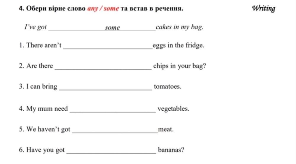 Нужны ответы на задачу по Обери вірне слово any/some та встав в речення.? Читайте множественные решения и рекомендации от участников. Ответы на этот вопрос [Наличие ответов: если есть ответы, то 'уже доступны', если нет — 'пока нет']. Присоединяйтесь к нашему сообществу, задавайте вопросы и делитесь своим опытом с другими.