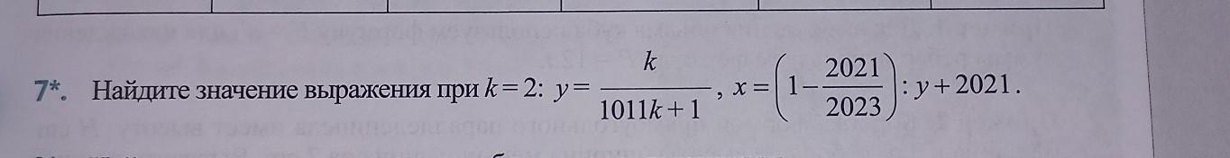 Решение задачи по 7*. Найдите значение выражения при k = 2: у= 9* Hax k 1011k +1 X= 2021 2023 : у+2021. для школьников студенческий. Прочитайте ответы, обсуждения и советы от других участников. Ответы на этот вопрос уже есть. Задавайте свои вопросы, получайте помощь и становитесь экспертом, помогая другим.