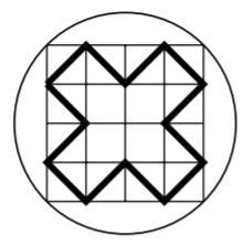 Олененок Веня нарисовал на своем ковре узор, показанный на рисунке. Чему равен периметр крестика, нарисованного жирной линией, если все маленькие квадраты одинаковы, а диаметр круга равен 20 см?