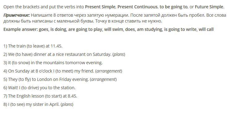 Open the brackets and put the verbs into Present Simple, Present Continuous, to be going to, or Future Simple.