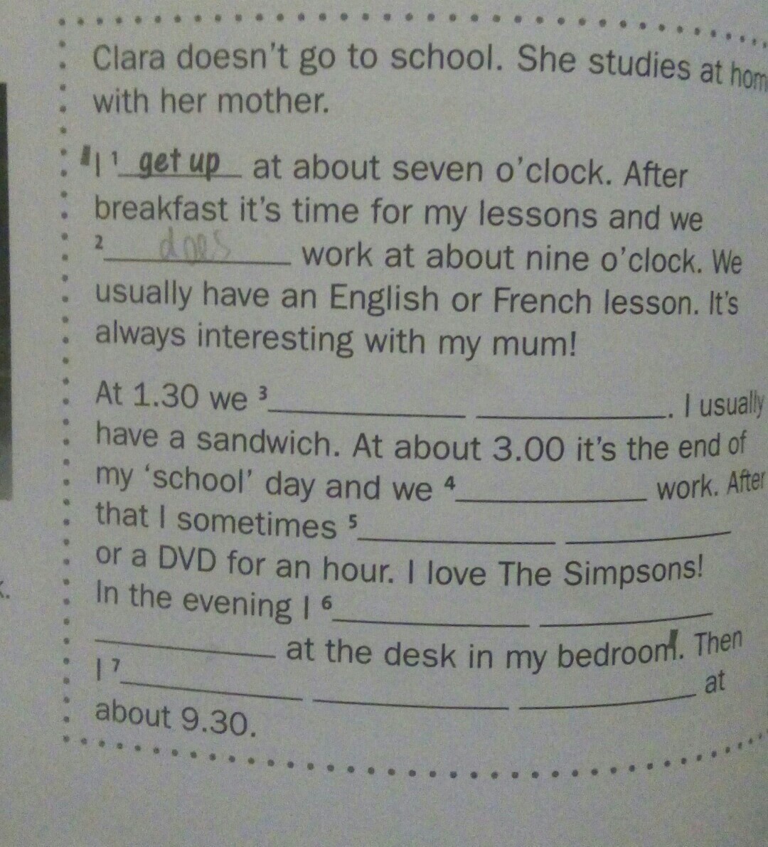 I get up at about seven o’clock. After breakfast it’s time for my lessons and we do work at about nine o’clock. We usually have an English or French lesson. It’s always interesting with my mum! At 1.39 we have lunch. I usually have a sandwich. At about 3.00 it’s the end of my ‘school’ day and we finish work. After that I sometimes watch television or a DVD for an hour. I love the Simpsons! In the evening I do my homework at the desk in my bedroom. Then I go to sleep at about 9.30.