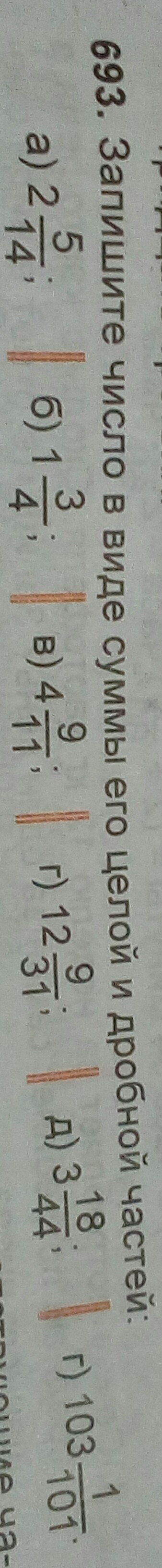 а) 2+5/14 б) 1+3/4 в) 4+9/11 г) 12+9/31 д) 3+18/44 е) 103+1/101