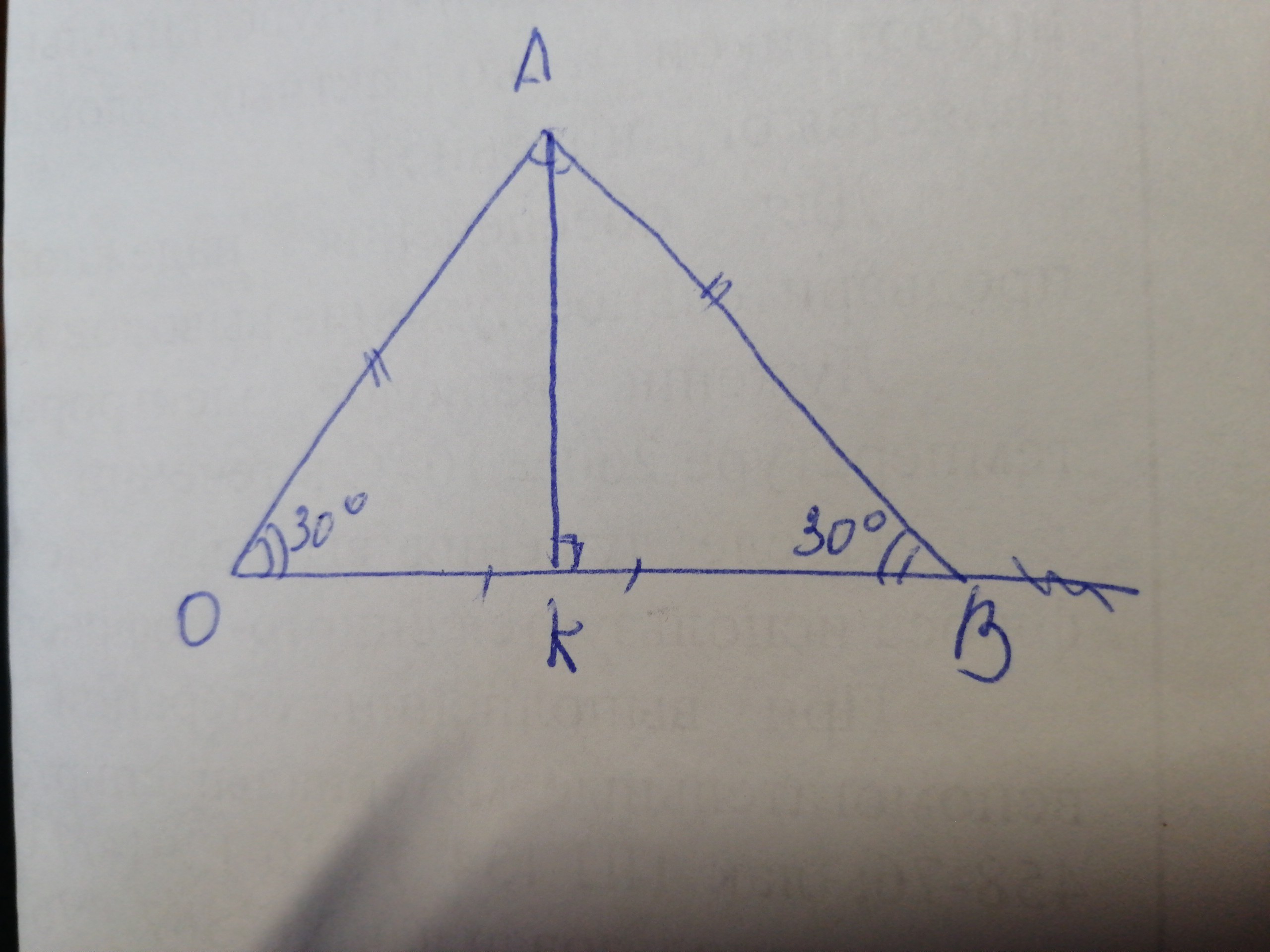 Треугольник ОАК является прямоугольным, т.к. АК в треуг. ОАВ является и высотой и медианой и бисектрисой. <АОК=<В, т.к. треуг. ОАВ равнобедренный, <ОАВ=1/2<А=1/2*120=60градусов и <АКО=90 градусов