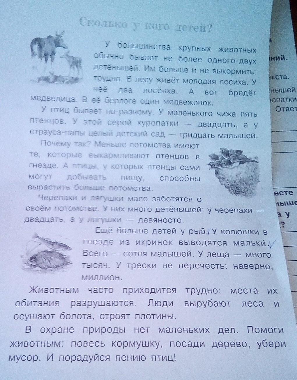 Медведь — гроза всех лесных обитателей. Только человеку он не так уж страшен. Человека медведь сам боится и первый не нападает. Бродит медведица с медвежатами, обнюхивает каждую кочку. Вдруг она насторожилась. Медвежата тоже приостановились. Не поймут, в чём дело. А медведица людей увидела. Медвежата тоже людей заметили. Хотели бежать навстречу — они привыкли никого не бояться. Но медведица как рявкнет — ив кусты. Медвежата потрусили за ней. Так и увела медведица малышей от самого страшного врага — человека. В другой раз зачуяла медведица свежий человеческий след, заворчала и бежать пустилась. Теперь медвежата будут уходить прочь даже от запаха человека. Так медвежата получили первый урок осторожности. (102) (По Г. Скребицкому) Вопросы: 1. Кем является медведь для лесных обитателей? 2. Каково поведение медведя по отношению к человеку? 3. Как действовала медведица при встрече с людьми? 4. Какой урок получили медвежата? В чём он заключался?