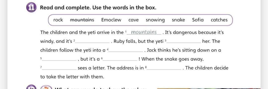 The children and the yeti arrive in the mountains . It’s dangerous because it’s windy, and it’s snowing. Ruby falls, but the yeti catches her. The children follow the yeti into a cave. Jack thinks he’s sitting down on a rock, but it’s a snake! When the snake goes away, Sofia sees a letter. The address is in Emoclew .The children decide to take the letter with them.