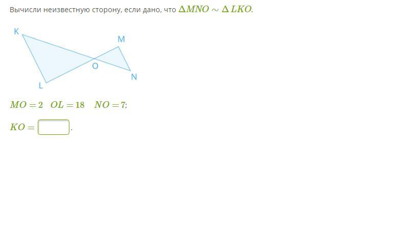 т.к. Δ MNO подобен Δ LKO OL/MO = KO/NO 18/2 = KO/7 9= KO/7 KO=63