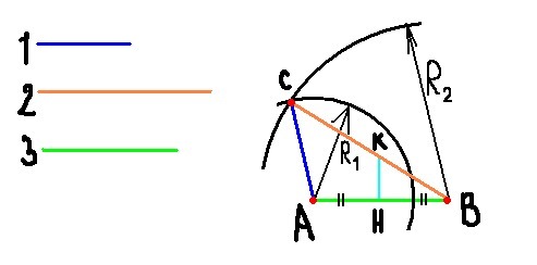 А) Чертим три линии — будущие стороны нашего треугольника. Я начертила три линии: 1 — синяя, 2 — оранжевая, 3 — зеленая. Сначала измеряем одну из линий (у меня линия 1 — зеленая) и перечерчиваем ее. Это будет сторона АВ. Теперь чертим кусочек окружности с центром в точке А и радиусом R₁, равным какой-нибудь из других двух сторон (у меня радиус R₁ равен стороне 2 — синей). Затем чертим еще кусочек окружности, но с центром в точке В и радиусом R₂, равным третьей оставшейся линии (у меня радиус R₂ равен стороне 3- оранжевой). Смотрим, в какой точке пересеклись две окружности. Это будет точка В нашего треугольника. Теперь соединяем стороны. Получился треугольник.