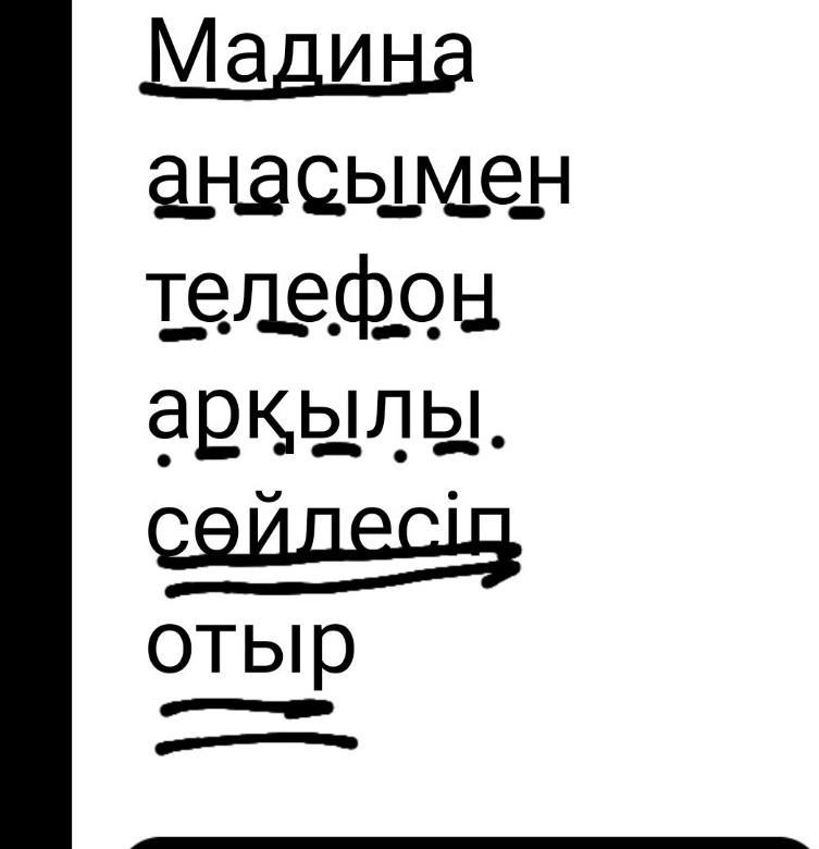 кім? Мадина- бастауыш. Кіммен?Анасымен-толықтауыш. Не арқылы? Телефон арқылы- пысықтауыш. Не істеп отыр?- Сөйлесіп отыр- баяндауыш