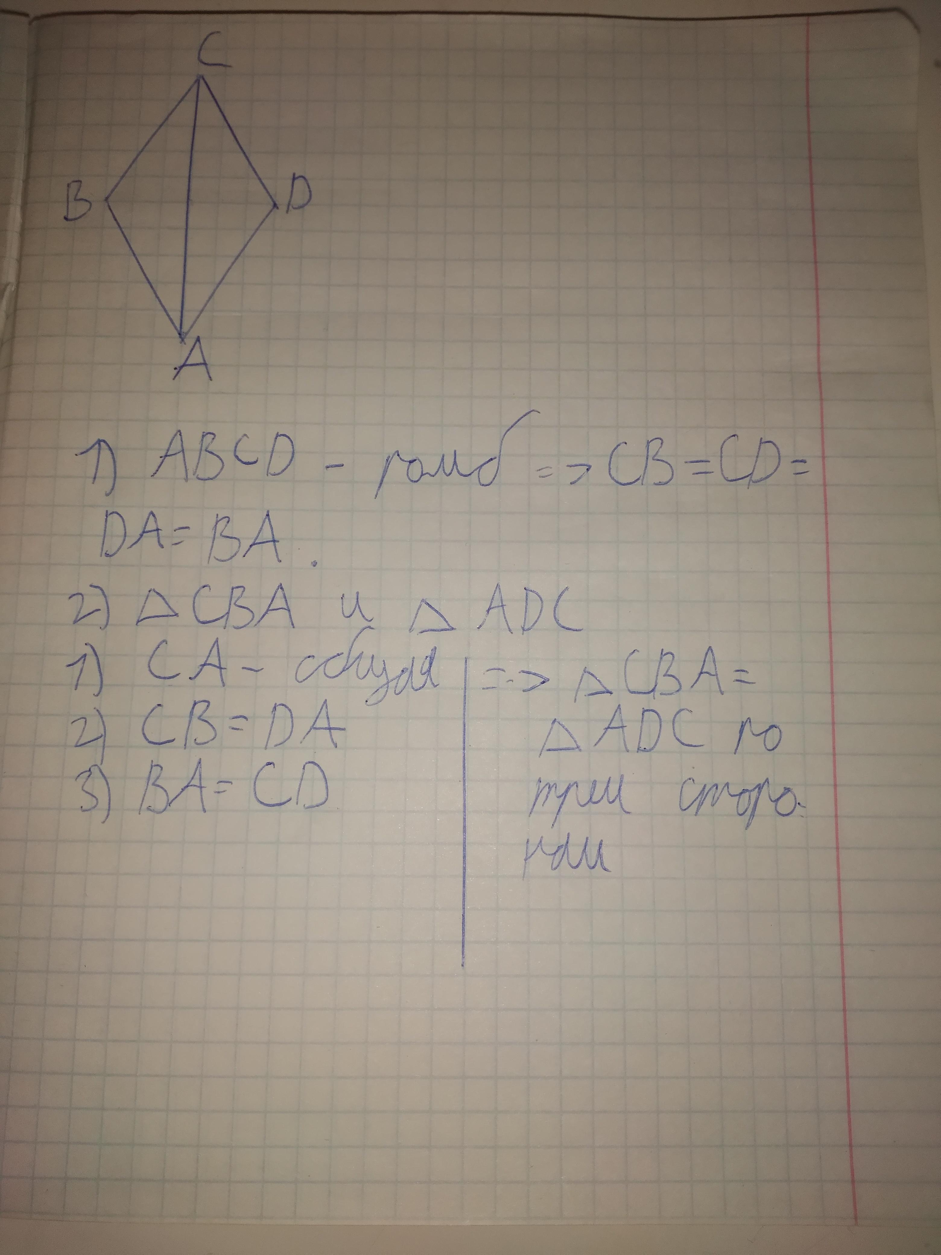 3. В ромбе АВСД провена диагональ АС, которая поделила ромб на 2 треугоника. Доказать, что треугольники равны.