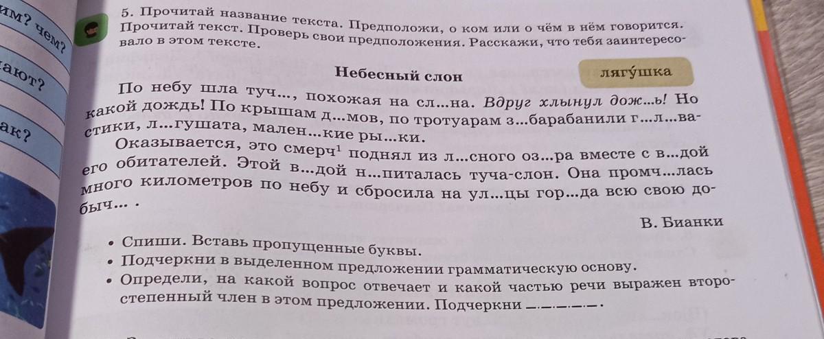 Ответ:туча,слона, дождь,домов, забарабанилизабарабанзабарабанили,головастики,лягушата, маленькие,рыбки,лесного,озера, водой, напиласьнапиталасьнапилась,