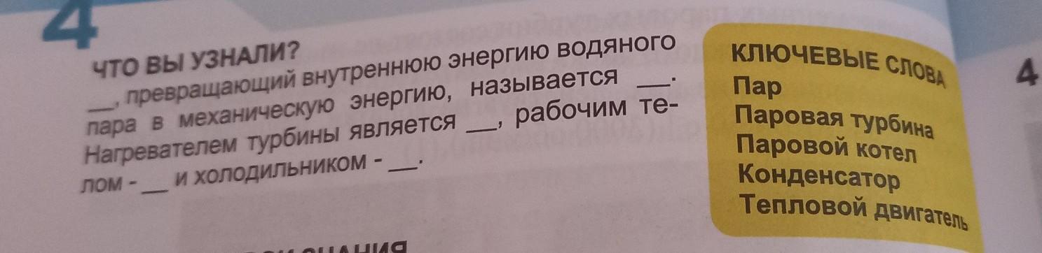 Тепловой двигатель, превращающий внутреннюю энергию водяного пара в механическую, называется паровой турбиной. Нагревателем турбины является паровой котёл, рабочим телом — пар и холодильником — конденсатор.